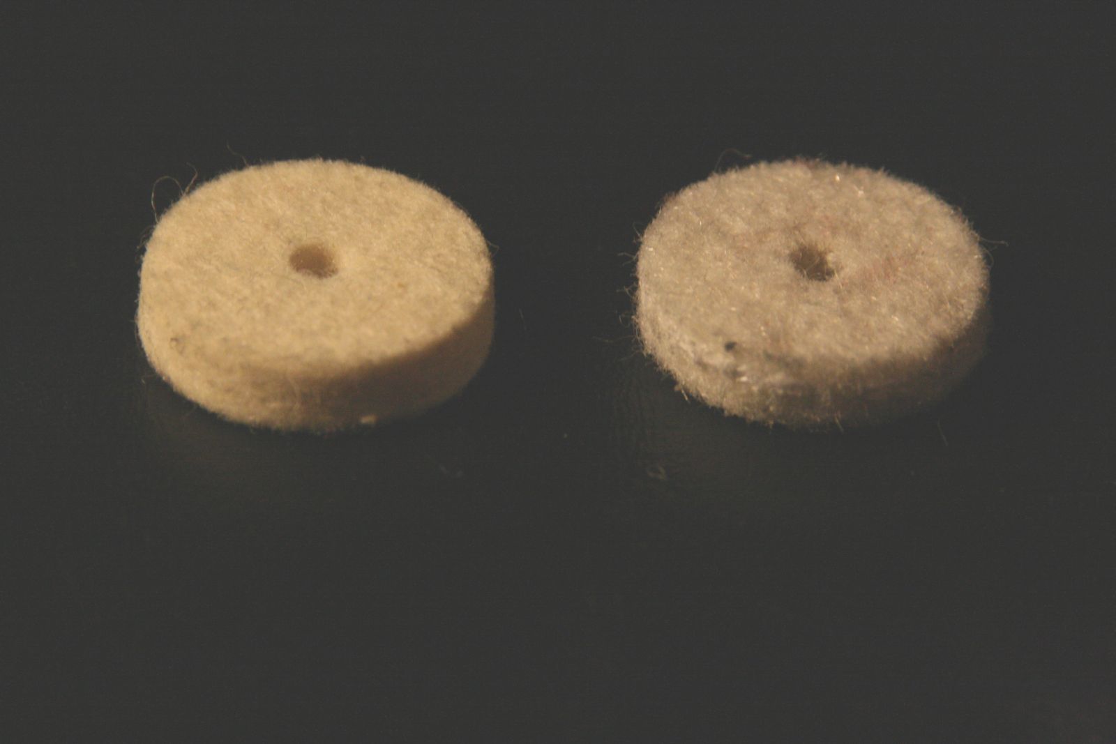 Hi folks.. A couple years back when this was a hot item for discussion the a couple posts were made in which it seemed like a suggestion was being made that Andre's idea for using hammer felt in conical shape for front punchings was not his idea at all and that Schimmel had been doing this for years. Not having a good enough camera at the time I couldn't really illustrate how false this idea was. Attached is a foto of both types. On the left Andre's ... known as Crescendo over there and sold by Jurgen. On the right is the cloth (not pressed felt) non-conically shaped punching that Schimmel has been using all these years. As you can see the Schimmel punching is just a standard front punching in white cloth...not green. I hope the sender of that claim a couple years back is reading. I said it then and I say it again. The pressed felt punching in conical shape was Andre's idea... and he deserves the credit for coming up with the idea. Cheers RicB -------------- next part -------------- A non-text attachment was scrubbed... Name: fronts.jpg Type: image/jpeg Size: 84164 bytes Desc: not available Url : https://www.moypiano.com/ptg/pianotech.php/attachments/20080117/4b6bb84e/attachment-0001.jpg