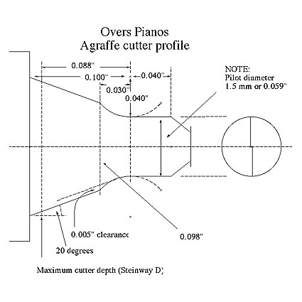 ---------------------- multipart/related attachment --============_-1224967358==_ma============ Terry, Roger and list, Included below is a drawing of the agraffe cutter profile we have been using for the past few years. We fax this drawing through to our local tool and cutter grinding man, ordering four at a time (double ended). As Roger said earlier, you cut from both sides of the agraffe. We use a small milling machine with depth stop control, to ensure that we end up with a donut shape in the centre of the agraffe. The easy way to check this is to cut a test agraffe in half. Regards, Ron O -- _________________________ Website: http://www.overspianos.com.au Email: mailto:ron@overspianos.com.au _________________________ --============_-1224967358==_ma============ An HTML attachment was scrubbed... URL: https://www.moypiano.com/ptg/pianotech.php/attachments/50/32/9a/73/attachment.htm --============_-1224967358==_ma============-- ---------------------- multipart/related attachment A non-text attachment was scrubbed... Name: agrcut.jpeg.jpg Type: image/jpeg Size: 35356 bytes Desc: not available Url : https://www.moypiano.com/ptg/pianotech.php/attachments/3c/67/fa/b8/agrcut.jpeg.jpg ---------------------- multipart/related attachment--