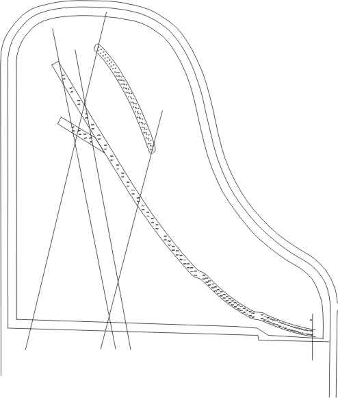 ---------------------- multipart/mixed attachment >Hi Ron! > >I'm not sure I understand how you want to achieve this and why it's easier >to adjust the impedance by using 3 bridges. With the usual two bridges, the low end of the tenor is pretty close on the soundboard to the low end of the bass. Since the low bass wants a considerably more flexible board than the low tenor, one of these bridges won't get what it wants from the soundboard assembly when they are in close proximity. Adding a transition bridge separates the low tenor from the low bass and gives you more room to tailor the soundboard impedance (with rib placement, panel thickness, grain angle, bass float, mass lading, and/or whatever) to more nearly meet the needs of the scale. With the transition, you can now make soundboard impedance in the low tenor more nearly match that of the high bass (which is what you ideally want) without killing the low bass. Here's a sketch showing both the original tenor bridge, and a transition. The one with the attachment didn't show up, so I'll try this. transbridge2.jpg >And, would you put 2-string unisons on both tenor and bass bridge, or just >on the tenor bridge? > > Calin Tantareanu Wrapped bichords on both the high bass and the transition, plain wire trichords on the long bridge. ---------------------- multipart/mixed attachment A non-text attachment was scrubbed... Name: transbridge2.jpg Type: image/jpeg Size: 22674 bytes Desc: not available Url : https://www.moypiano.com/ptg/pianotech.php/attachments/b4/45/b5/e5/transbridge2.jpg ---------------------- multipart/mixed attachment Ron N ---------------------- multipart/mixed attachment--