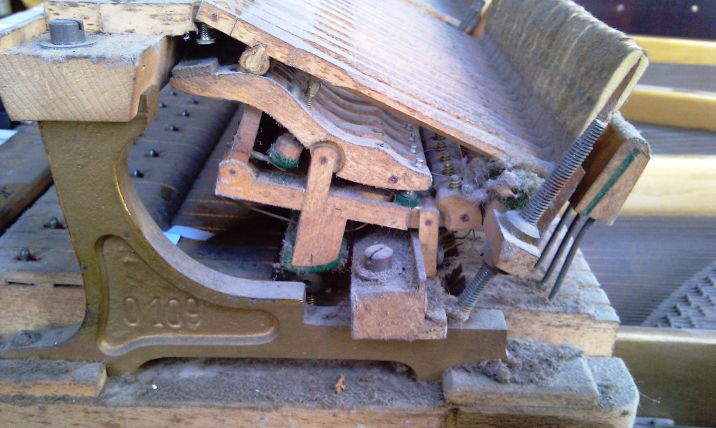 Might what we took to be a spoon pressing against the letoff button really be the repetition spring, looped to the front of the jack? If so, what will press on the letoff button? I agree, fun action .... David, could we get some more photos? Susan Overs Pianos wrote: > Susan, > >> . . . Might there be a small coil spring hidden inside >> the curve, pushing directly against the top part of the jack? > > I believe your speculation regarding a spring is correct, but it will > be the repetition-spring which is doing the work for the jack return > also. Notice that the rep' spring runs through what is almost > certainly a slotted wippen heel. There must be a loop cord which we > can't see, which is attached to the front of the jack (on the > key-front side of the jack-centre), so that the spring provides the > reverse jack rotation which is required to return it under the knuckle > after lett-off. This is an interesting concept, because with this > arrangement the jack escapement will be running in the same direction > as the rotation of the roller as the let-off point is approached. > Let-off should be a little less obvious in this action than it is with > a conventional arrangement. The idea of the lower > repetition-lever-centre is almost certainly intended to lower friction > between the knuckle and repetition lever during the let-off. But I > suspect that the centre has been lowered to such a degree that there > may well be some friction in the opposite direction to that which is > usual, with respect to a 'standard' action. > > Ron O. > -- > > *OVERS PIANOS - SYDNEY* > / //Grand Piano Manufacturers/ > _______________________ > > Web http://overspianos.com.au > mailto:ron at overspianos.com.au > _______________________ > > /A web page with images of recent work and almost-audio-CD quality mp3 > sound files of the Overs piano can be found at;/ > /http://overspianos.com.au/more_info.htm/ > / > / > /So put on your headphones, plug them into your freshly restarted > computer and sit back to over 20 minutes of pure piano./ > _______________________ > -------------- next part -------------- An HTML attachment was scrubbed... URL: <https://www.moypiano.com/ptg/pianotech.php/attachments/20120924/04db0118/attachment-0001.htm> -------------- next part -------------- A non-text attachment was scrubbed... Name: not available Type: image/jpeg Size: 139067 bytes Desc: not available URL: <https://www.moypiano.com/ptg/pianotech.php/attachments/20120924/04db0118/attachment-0001.jpeg>